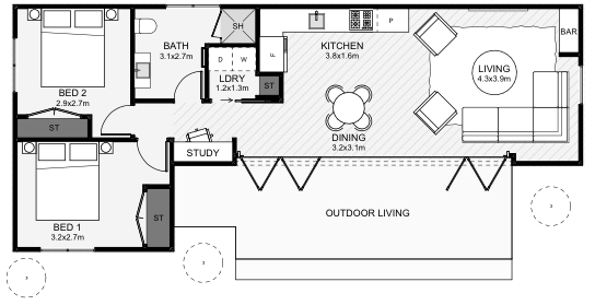 This small, modern gable roof home is designed with style and functionality in mind. The 'L-shape' layout features two bedrooms and high ceilings, creating a bright and spacious feel. The light colour exterior is accented by stunning dark joinery, adding a touch of sophistication to the design. A study nook provides a quiet space to work, and a separate laundry room adds convenience. The living area features large bifold doors, providing a seamless connection to the outdoors, and an optional bar adds to the entertaining possibilities. With its mix of modern and traditional elements, this timeless design is sure to be a classic that will stay in fashion.